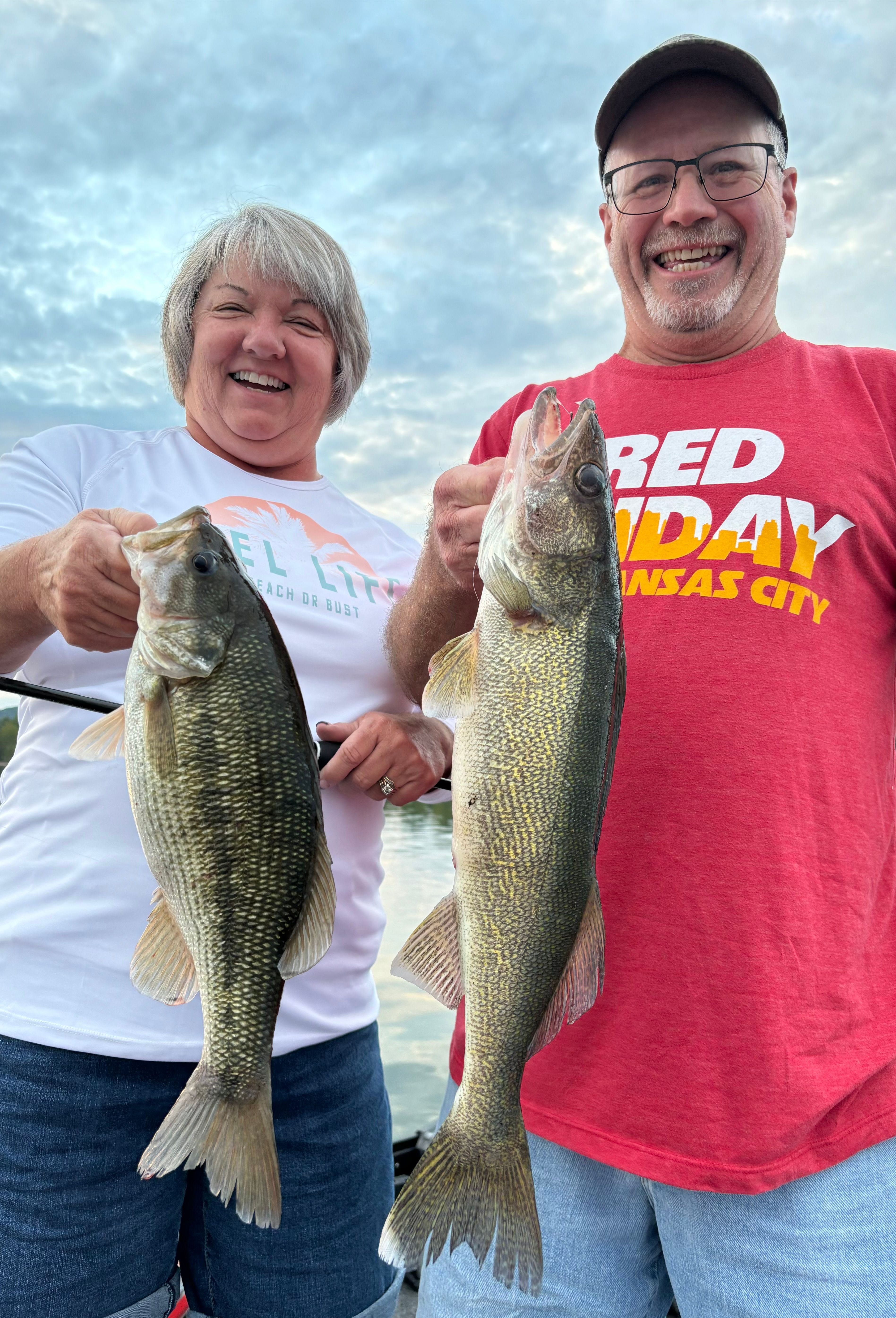 Walleye: Table Rock's "other" predator, walleye provide a nice change of pace from bass fishing. They're most active in low light conditions, so our afternoon trips can be prime time to target these tasty critters. We'll often find them along deeper channel edges or suspended over points, ready to inhale a nightcrawler harness or deep-diving crankbait.